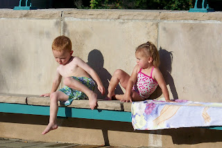 Saturday after our Camping Trip, Liz and Cory arrived from Phoenix, AZ. They came to visit the family but really wantd to see the kids so we met up at the Promenade for some water fun. The kids were so excited to see Liz and Cory they knew exactly who they were and greeted them with big open arms! Then they saw the sprinklers and ran over to them...