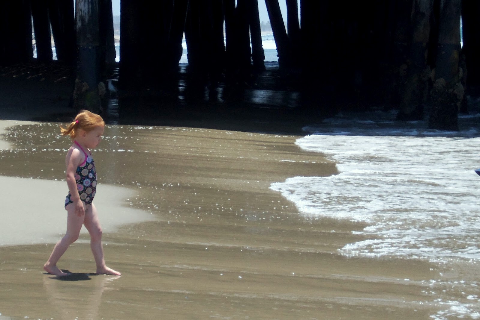 After we finally walked all the way to the edge of the pier, and down to the beach - we changed into suits, dunked the kids in sunscreen and went to play in the Ocean!