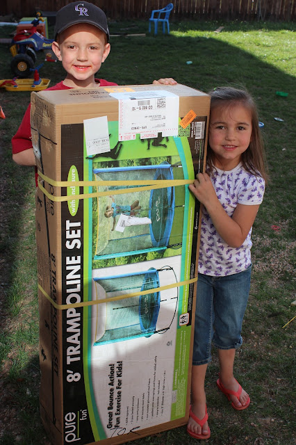 Nathan and I were against buying a family trampoline. We knew a lot of people who had one and if the kids wanted to "jump" we would invite ourselves over to someone's to play. Lucas has asked for a trampoline every single year since he was 3. Bridget has started asking as well. A few weeks ago we went to my friend Desi's house to play and they had an 8 foot trampoline that was only 2 feet high. We noticed something. The babies were playing on it too! Easy on, easy off.